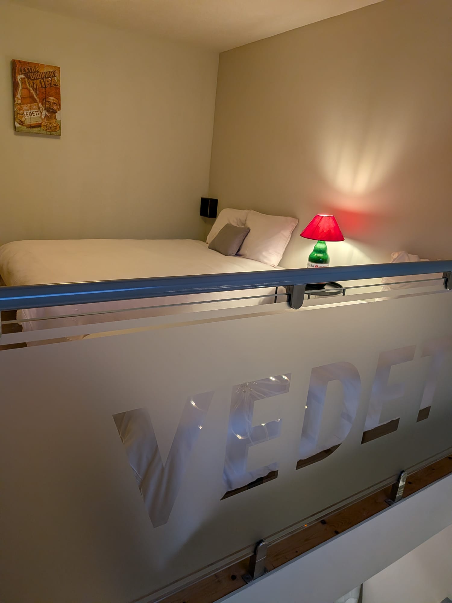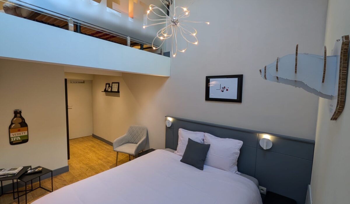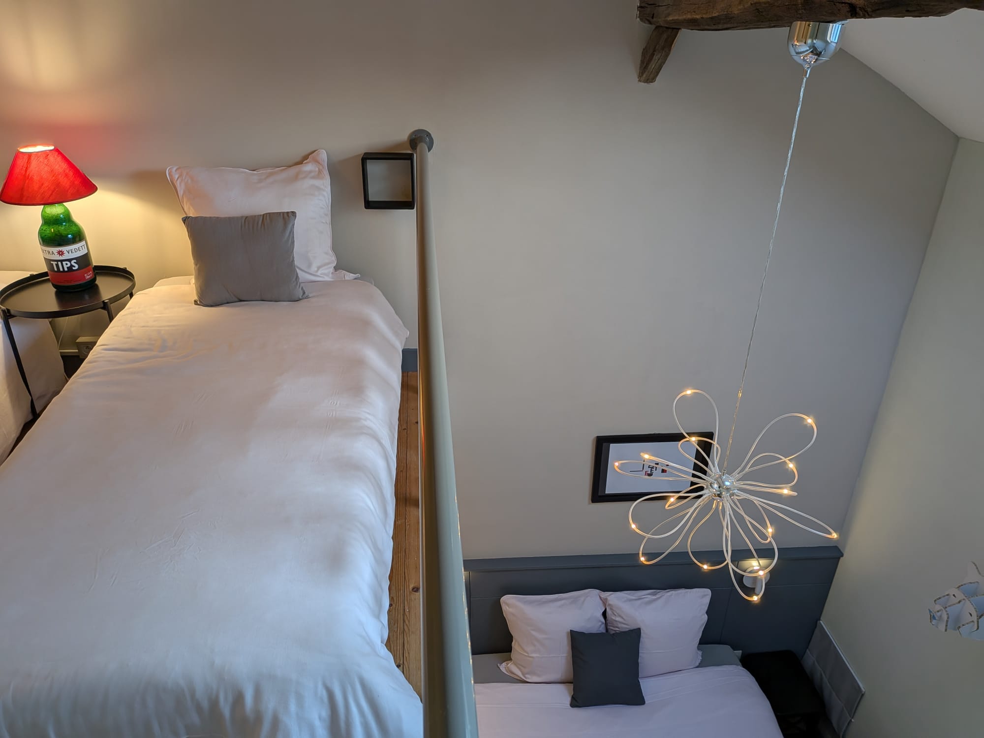 Familiekamer op de 1e verdieping. 2x tweepersoonsbed (160 cm + 140 cm);1 éénpersoonsbed van 90 cm in de duplex. Max 5 personen met kinderen (of 4 volwassenen).